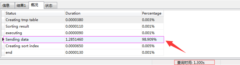 我们可以看到,这条语句用了 1.300 秒, 而 Sending data 就用了 1.28 秒,占用了将近 99% 的时间,所以,我们对这个进行优化。