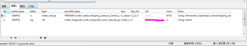 explain SELECT og.goods_barcode, og.color_id, og.size_id, SUM(og.goods_number) AS sold_number FROM order o LEFT JOIN order_goods og ON o.order_id = og.order_id WHERE o.is_send = 0 AND o.shipping_status = 0 AND o.create_time > '2017-10-10 00:00:00' AND o.ck_id = 1 AND og.goods_id = 13421 AND o.is_separate = 1 AND o.order_status IN (0, 1) AND og.is_separate = 1 GROUP BY og.color_id, og.size_id
