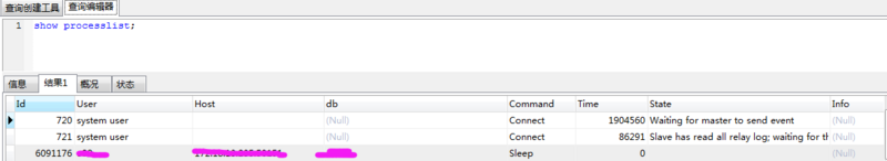 于是想到了使用 show processlist 查看sql语句执行状态,查询结果如下:
