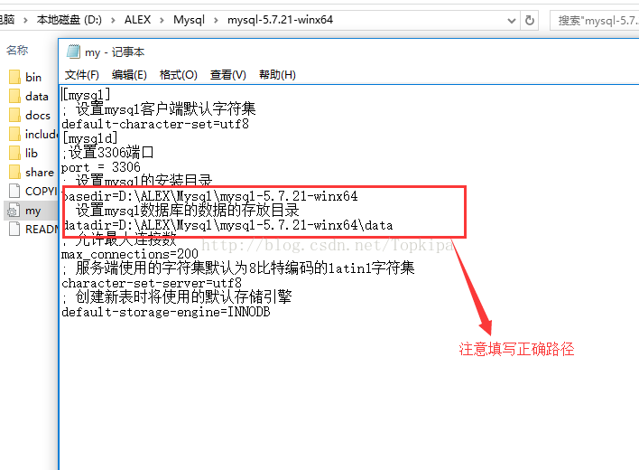 [mysql] ; 设置mysql客户端默认字符集 default-character-set=utf8 [mysqld] ;设置3306端口 port = 3306 ; 设置mysql的安装目录 basedir=D:\ALEX\Mysql\mysql-5.7.21-winx64 ; 设置mysql数据库的数据的存放目录 datadir=D:\ALEX\Mysql\mysql-5.7.21-winx64\data ; 允许最大连接数 max_connections=200 ; 服务端使用的字符集默认为8比特编码的latin1字符集 character-set-server=utf8 ; 创建新表时将使用的默认存储引擎 default-storage-engine=INNODB