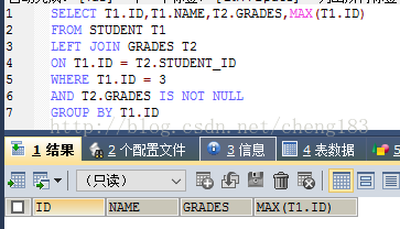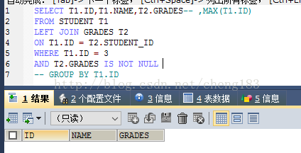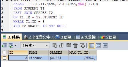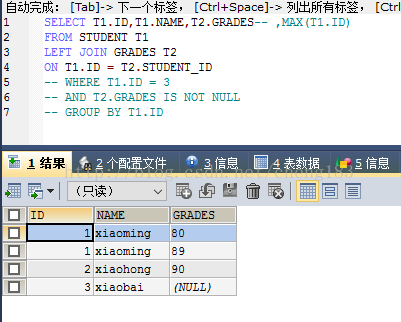 CREATE TABLE `grades` ( `id` int(20) NOT NULL AUTO_INCREMENT, `student_id` int(20) NOT NULL, `subject` varchar(20) COLLATE utf8_bin DEFAULT NULL, `grades` varchar(20) COLLATE utf8_bin DEFAULT NULL, PRIMARY KEY (`id`) ) ENGINE=InnoDB AUTO_INCREMENT=4 DEFAULT CHARSET=utf8 COLLATE=utf8_bin; insert into `grades`(`id`,`student_id`,`subject`,`grades`) values (1,1,'语文','80'),(2,1,'数学','89'),(3,2,'语文','90'); CREATE TABLE `student` ( `id` int(20) NOT NULL AUTO_INCREMENT, `name` varchar(20) COLLATE utf8_bin DEFAULT NULL, PRIMARY KEY (`id`) ) ENGINE=InnoDB AUTO_INCREMENT=4 DEFAULT CHARSET=utf8 COLLATE=utf8_bin; insert into `student`(`id`,`name`) values (1,'xiaoming'),(2,'xiaohong'),(3,'xiaobai');