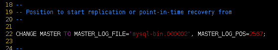 注意最后的两个命令:MASTER_LOG_FILE和MASTER_LOG_POS,表示从库的从哪个二进制文件开始读取,偏移量从那里开始,这两个参数可以从我们导入的SQL里面找到。