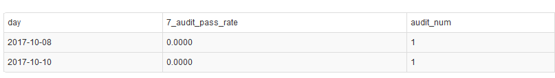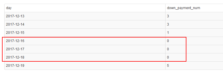按照天数统计每天的总数,如果其中有几天没有数据,那么group by 返回会忽略那几天,如何填充0?如下图,统计的10-3~10-10 7天的数据,其中只有8号和10号有数据,这样返回,数据只有2个,不符合报表统计的需求。期望没有值填0