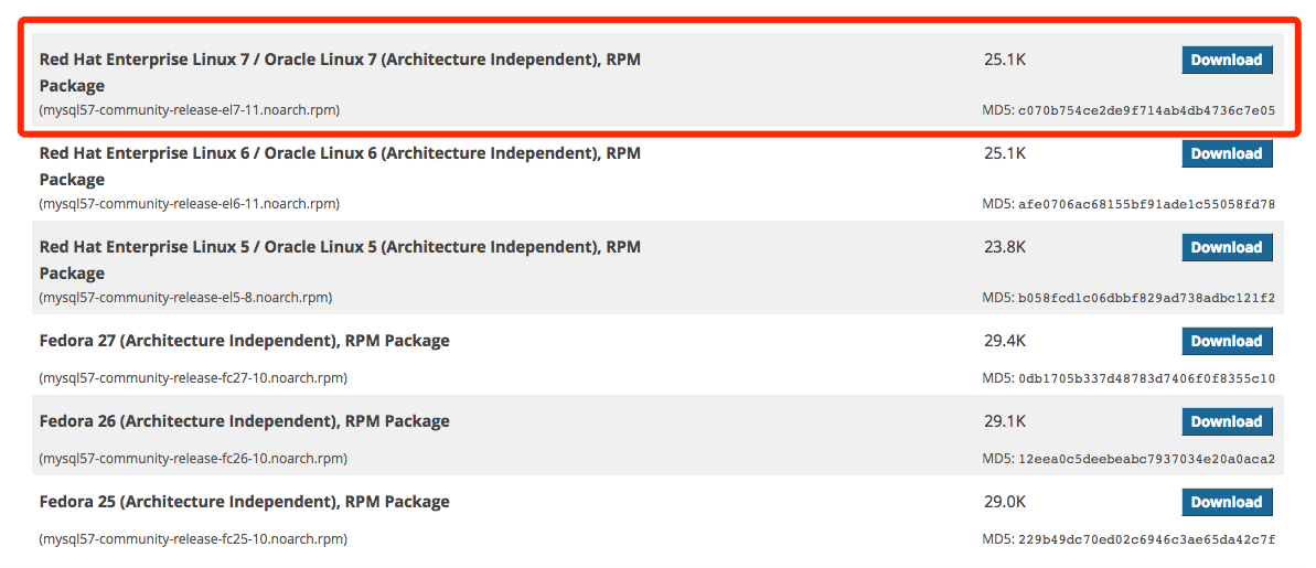 在 https://dev.mysql.com/downloads/repo/yum/ 找到 yum 源 rpm 安装包