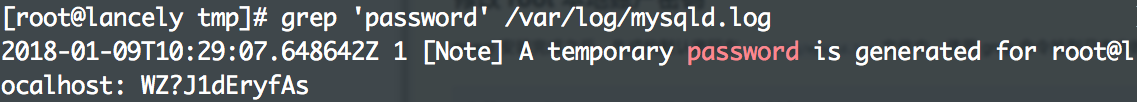 mysql 安装完成之后,生成的默认密码在 /var/log/mysqld.log 文件中。使用 grep 命令找到日志中的密码。