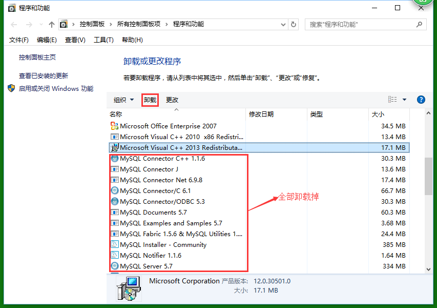step2:图一跳转 or windows键+R-->Control-->程序和功能;所有MySQL程序点击右键卸载