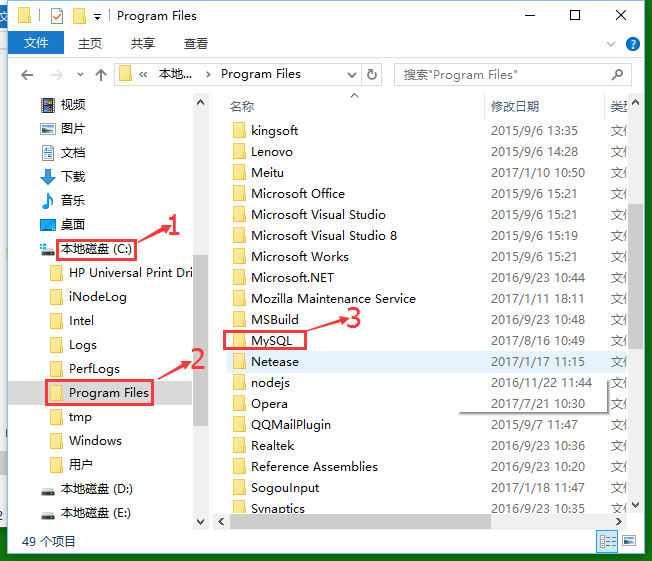 step3:本人安装目录在C盘,首先打开C:\Program Files,删除MySQL文件夹