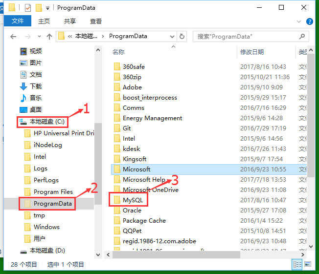 step4:打开隐藏文件ProgramData文件夹,删除下面的MySQL文件
