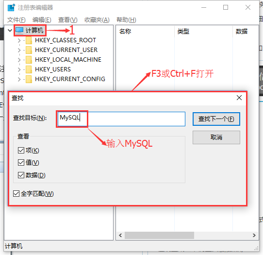 还有就是F3或Ctrl+F打开查找框,输入MySQL,注意焦点放在计算机上