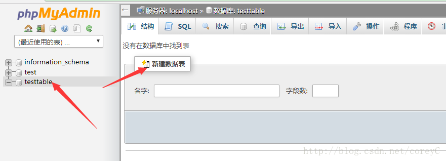 第二步:新建一个数据表,并且选好排序规则,此处我使用testtable。