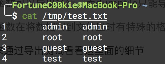 首先通过命令 select * from test into outfile '/tmp/test.txt' 来使用outfile导出