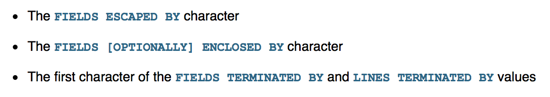 其中 FIELDS ESCAPED BY 可以用来对指定的字符进行转义, FIELDS [OPTIONALLY] ENCLOSED BY 用来对字段值进行包裹, FIELDS TERMINATED BY 用来对字段值之间进行分割