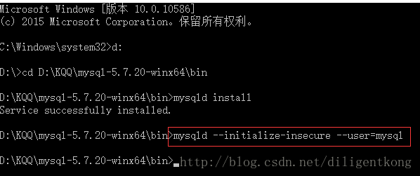 (执行完上面命令后,MySQL会自建一个data文件夹,并且建好默认数据库,用户名默认是root,密码默认为空