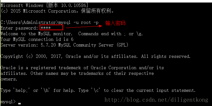 cmd窗口输入:mysql -u root –p,回车,出现enter password后,再回车。如图: