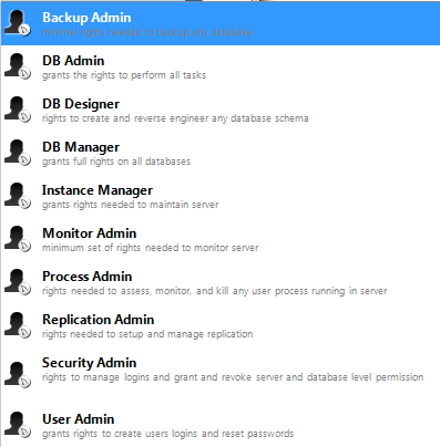 Host表示能连接到该数据库的主机地址,可设置为本地(localhost/127.0.0.1)、一个外部IP(如218.17.224.228)、一个外部网段(如218.17.224.*)或者所有主机(%)。 Role表示该账户的角色,可选择的角色如下: