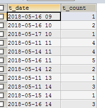 SELECT DATE_FORMAT(t.`create_time`, '%Y-%m-%d %H') t_hour, COUNT(1) t_count FROM t_order t WHERE t.`create_time` > '2018-05-11' GROUP BY DATE_FORMAT(t.`create_time`, '%Y-%m-%d %H');
