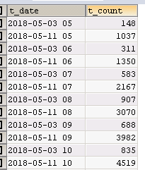 SELECT DATE_FORMAT(t.`create_time`, '%Y-%m-%d %H') t_date, COUNT(1) t_count FROM yyd_order t WHERE t.`create_time` > '2018-05-11' GROUP BY DATE_FORMAT(t.`create_time`, '%Y-%m-%d %H') ORDER BY DATE_FORMAT(t.`create_time`, '%H'),DATE_FORMAT(t.`create_time`, '%Y-%m-%d %H');