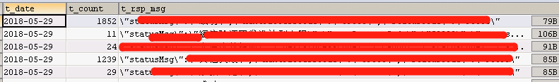 SELECT DATE_FORMAT(t.`create_time`, '%Y-%m-%d') t_date, COUNT(1) t_count, SUBSTRING_INDEX(SUBSTRING_INDEX(t.`msg`, '{', -1), '}', 1) t_rsp_msg FROM