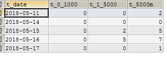 SELECT DATE_FORMAT(t.create_time,'%Y-%m-%d') t_date, SUM(IF(t.`amount`>0 AND t.`amount`<1000, 1, 0)) t_0_1000, SUM(IF(t.`amount`>1000 AND t.`amount`<5000, 1, 0)) t_1_5000, SUM(IF(t.`amount`>5000, 1, 0)) t_5000m FROM mobp2p.`yyd_order` t WHERE t.`create_time` > '2018-05-11' GROUP BY DATE_FORMAT(t.`create_time`, '%Y-%m-%d');