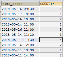 SELECT CONCAT(DATE_FORMAT(create_time, '%Y-%m-%d %H:' ),IF(FLOOR(DATE_FORMAT(create_time, '%i') / 30 ) = 0, '00','30')) AS time_scope, COUNT(*) FROM yyd_order WHERE create_time>'2018-05-11' GROUP BY time_scope ORDER BY DATE_FORMAT(create_time, '%H:%i'), DATE_FORMAT(create_time, '%Y-%m-%d') DESC ;