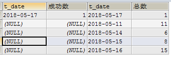 SELECT * FROM (SELECT DATE_FORMAT(t.`create_time`, '%Y-%m-%d') t_date,COUNT(1) '成功数' FROM yyd_order t WHERE t.`create_time` > '2018-05-17' AND t.`status` = 'repay_yes' GROUP BY DATE_FORMAT(t.`create_time`, '%Y-%m-%d')) t1 RIGHT JOIN (SELECT DATE_FORMAT(t.`create_time`, '%Y-%m-%d') t_date,COUNT(1) '总数' FROM yyd_order t WHERE t.`create_time` > '2018-05-11' GROUP BY DATE_FORMAT(t.`create_time`, '%Y-%m-%d')) t2 ON t1.t_date=t2.t_date;