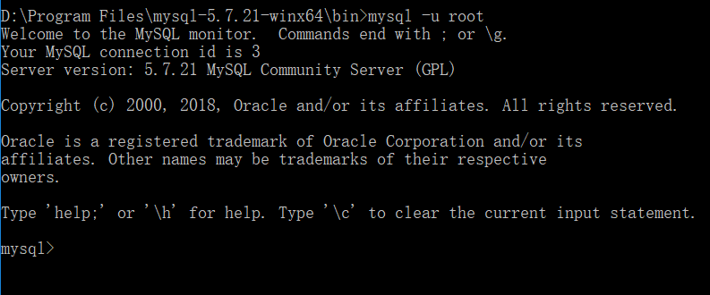 mysqld --defaults-file="D:\Program Files\mysql-5.7.21-winx64\my.ini" --initialize-insecure