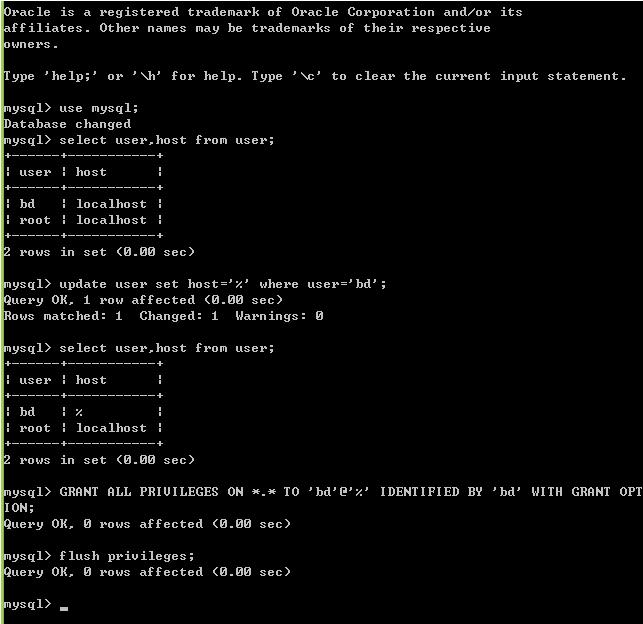 mysql> update user set host='%' where user='bd'; mysql> flush privileges;