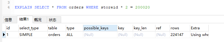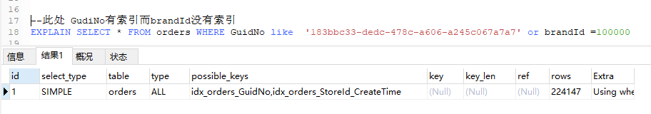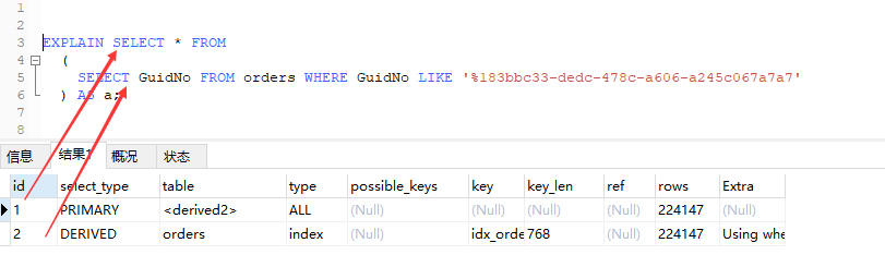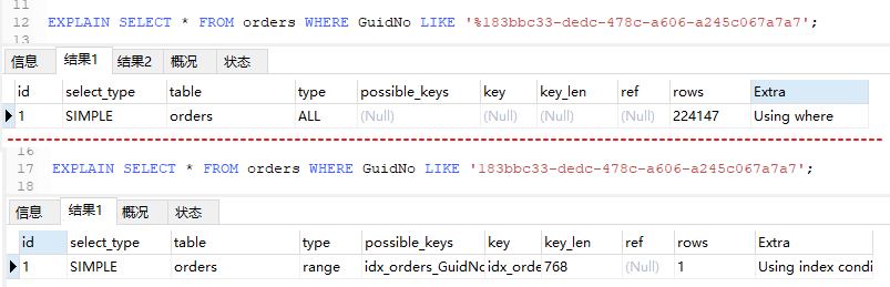 下图中第一句使用的%,没有使用索引,从rows为224147,使用索引rows为1。