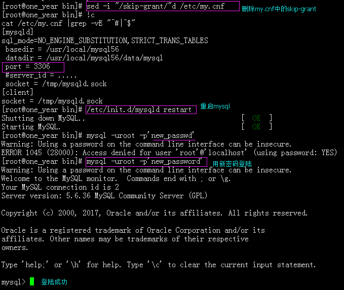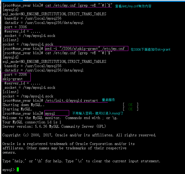 在[mysqld]模块下加入skip-grant ,然后重启mysql服务:sed -i '/3306/a\skip-grant' /etc/my.cnf