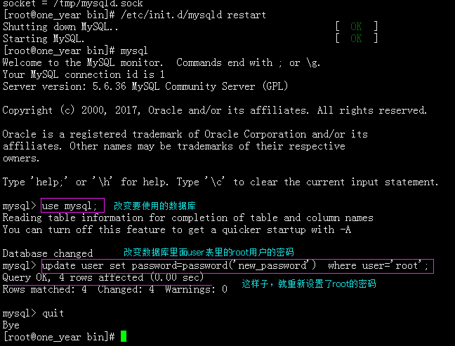 然后,再在数据库里面修改root密码:update user set password=password('new_password') where user='root';