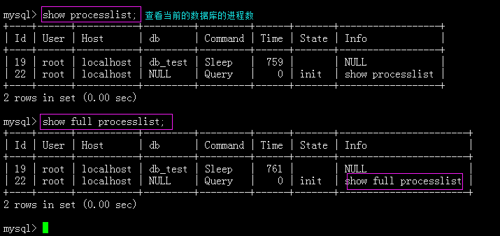 查看目前的进程数:show processlist; 或show full processlist; #这是用得最多的(即查看数据库正在进行的操作)