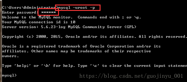 也可以输入”net start mysql”启动mysq,出现上面界面说明启动成功了。然后输入“mysql -hlocalhost -uroot -proot”(“-h”后的是你的ip,“-u”后的是你的用户名,“-p”后的是你的密码。如果没有密码可以写成“mysql -hlocalhost -uroot -p”),然后点击回车。出现下面界面说明数据库连接成功。