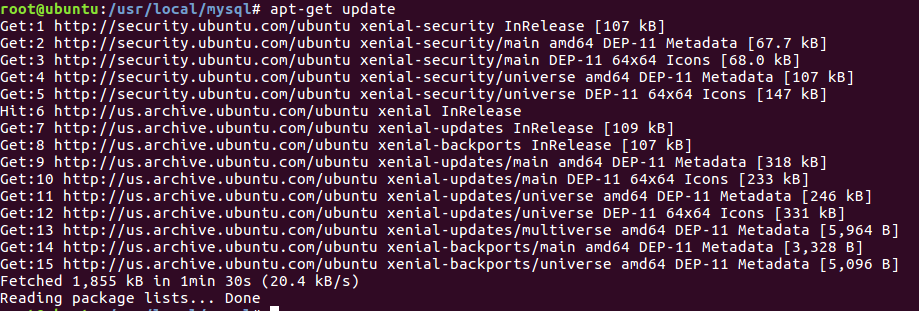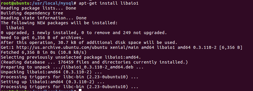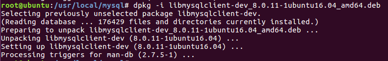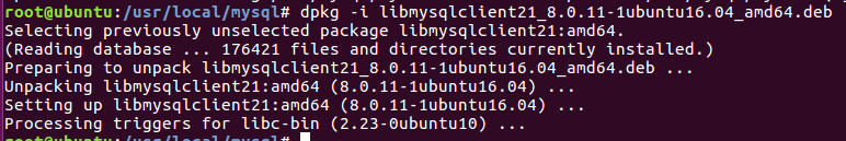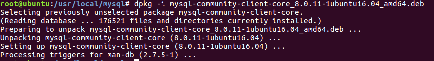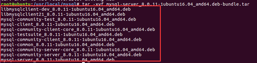 将下载好的MySQL使用命令"cp mysql-server_8.0.11-1ubuntu16.04_amd64.deb-bundle.tar /usr/local/mysql"把MySQL拷贝到自己指定的路径文件夹mysql里面,然后进到mysql里面对文件进行解压,使用命令"tar -xvf mysql-server_8.0.11-1ubuntu16.04_amd64.deb-bundle.tar" 对 MySQL解压,解压后得到如下几个文件。