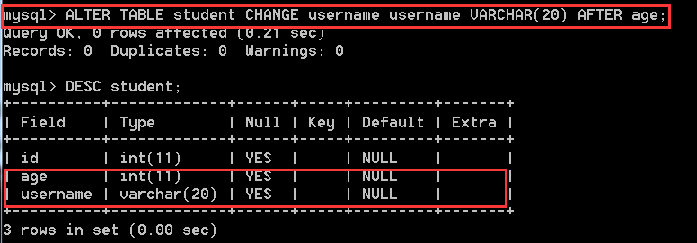 ALTER TABLE student MODIFY username VARCHAR(20) AFTER age;
