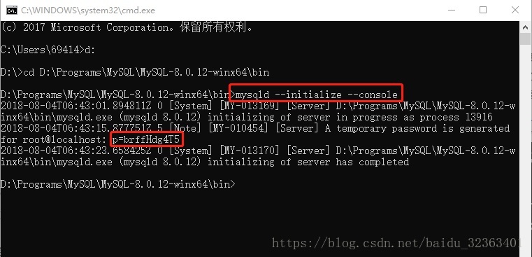 注:初始化完成后,不要关闭窗口,因为这里会生成root用户的密码,图中的“p=brffHdg4T5”即是随机密码。