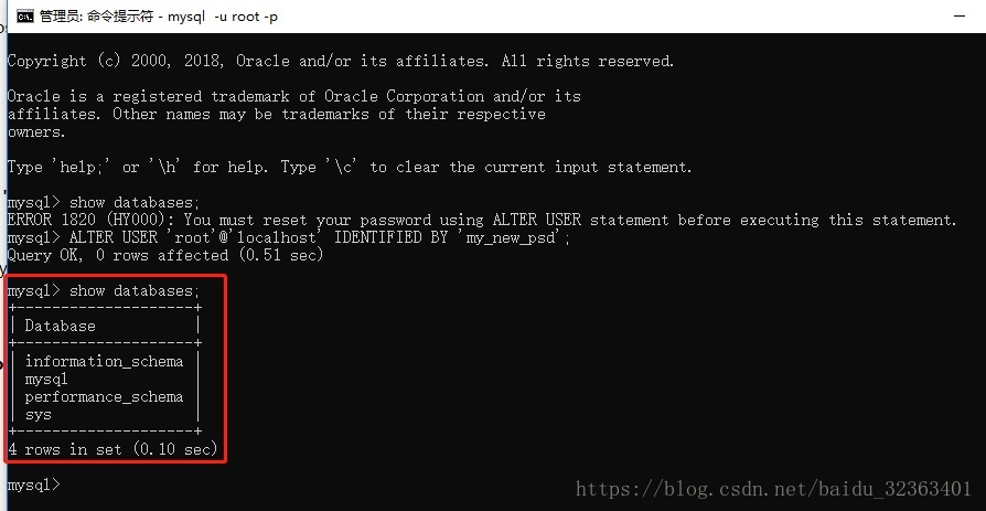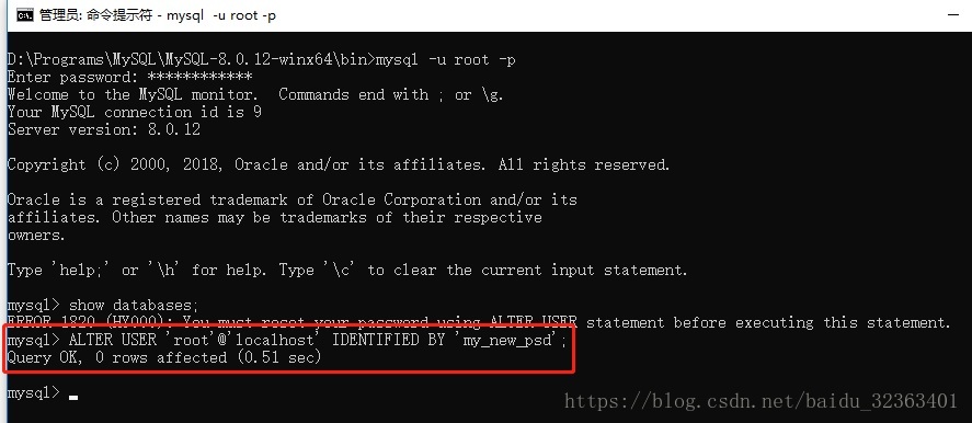 使用指令“ALTER USER ‘root'@'localhost' IDENTIFIED BY ‘my_new_psd';”,按回车键即可: