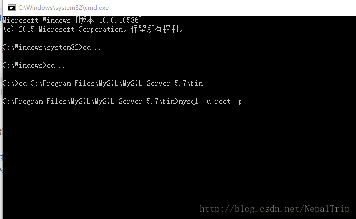 不过每次使用的时候,必须进入mysql的安装bin目录才可以通过mysql -u root -p 进入,如下