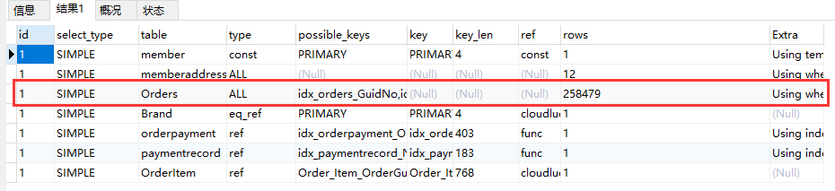 然后就用EXPLAIN分析了一下,发现Orders表没有命中索引,但是查询Orders中的GuidNo已经设置了索引,但就是不能命中。