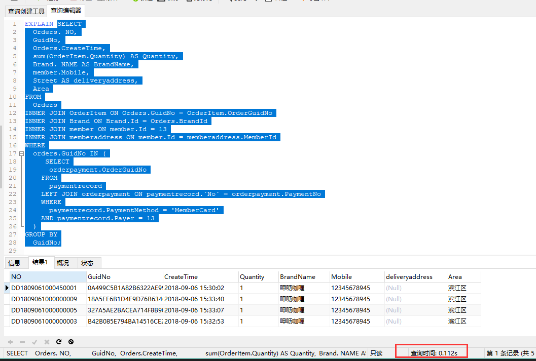 SELECT Orders. NO, GuidNo, Orders.CreateTime, sum(OrderItem.Quantity) AS Quantity, Brand. NAME AS BrandName, member.Mobile, Street AS deliveryaddress, Area FROM Orders INNER JOIN OrderItem ON Orders.GuidNo = OrderItem.OrderGuidNo INNER JOIN Brand ON Brand.Id = Orders.BrandId INNER JOIN member ON member.Id = 13 INNER JOIN memberaddress ON member.Id = memberaddress.MemberId WHERE orders.GuidNo IN ( '0A499C5B1A82B6322AE99D107D4DA7B8', '18A5EE6B1D4E9D76B6346D2F6B836442', '327A5AE2BACEA714F8B907865F084503', 'B42B085E794BA14516CE21C13CF38187', 'FBC978E1602ED342E5567168E73F0602' ) GROUP BY GuidNo