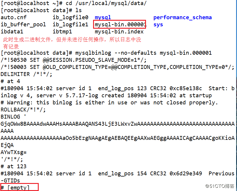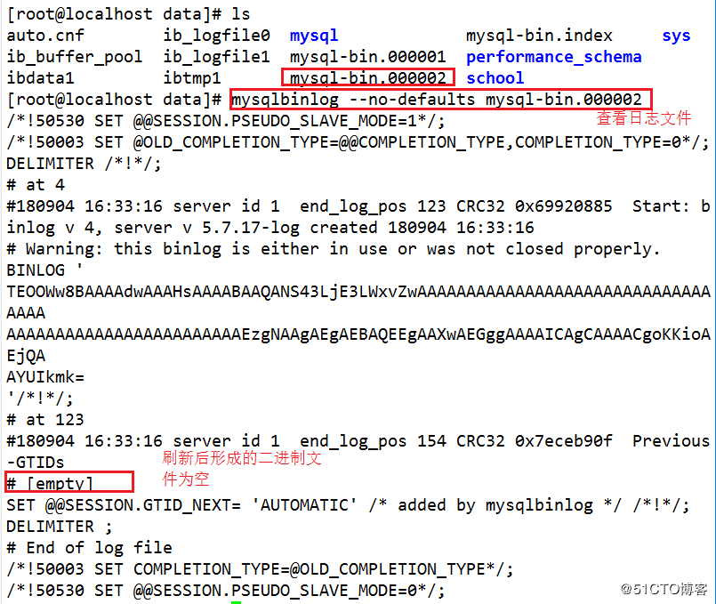 5、刷新日志,生成新的日志,注意:之前数据库的操作写入编号为000001的日志中,新生成的000002的日志为空