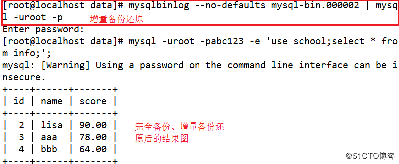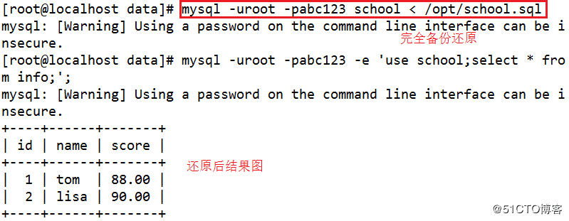 mysql -uroot -pabc123 school < /opt/school.sql #完全备份还原