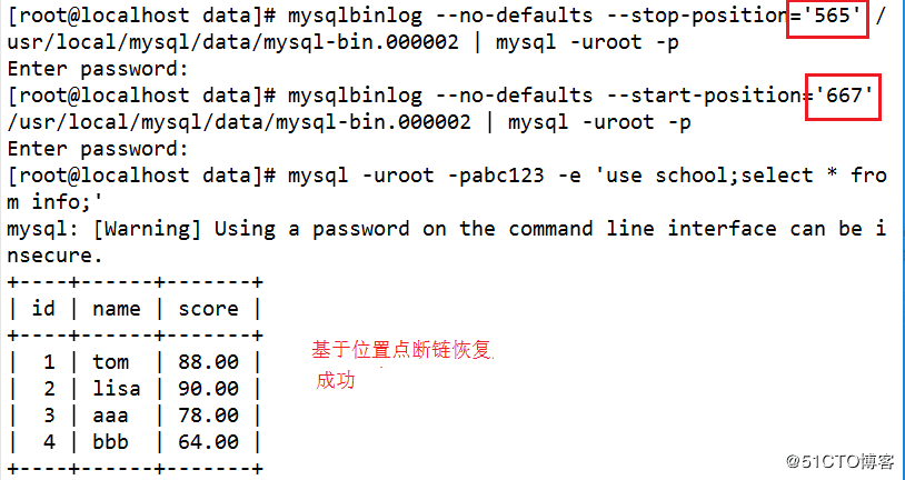 mysqlbinlog --no-defaults --stop-position='565' /usr/local/mysql/data/mysql-bin.000002 | mysql -uroot -p