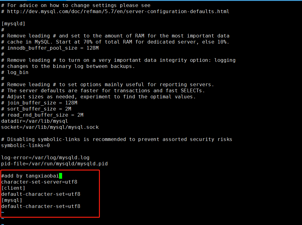 #add by tangxiaobai character-set-server=utf8 [client] default-character-set=utf8 [mysql] default-character-set=utf8