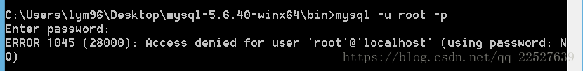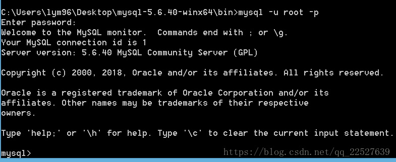 C:\Users\lym96\Desktop\mysql-5.6.40-winx64\bin>mysql -u root -p(-u用户名,-p密码)