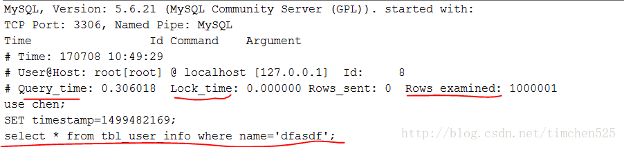 该条语句即是慢查询语句,之后,便可以在相应的日志输出文件或表中去查看是否有该条语句。