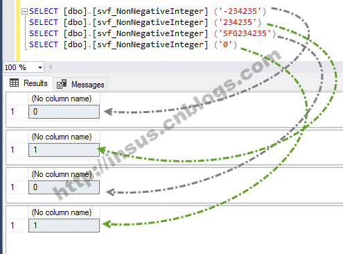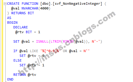CREATE FUNCTION [dbo].[svf_NonNegativeInteger] ( @val NVARCHAR(4000) ) RETURNS BIT AS BEGIN DECLARE @rtv BIT = 1 SET @val = ISNULL(LTRIM(RTRIM(@val)), N'-') IF @val LIKE '%[^0-9]%' OR @val = N'' SET @rtv = 0 ELSE SET @rtv = 1 RETURN @rtv END