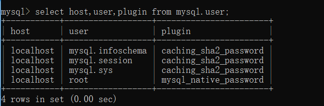 select host,user,plugin from mysql.user;