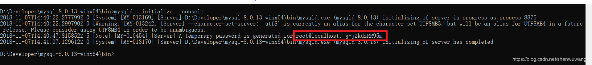 上图中红圈所圈为root账户及密码,密码是由mysql自动生成,且不带空格,首次登陆root用户需要使用,因此必须记住。如果没有记住,则需要将mysql安装目录data下的数据删掉,重新初始化。