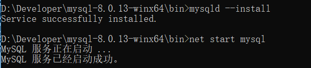 显示安装成功,则输入net start mysql启动服务,输入net stop mysql停止服务。