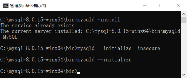 在命令行中进入bin目录后,先输入‘mysqld --initialize--insecure',回车后再次在bin目录下输入‘mysqld --initialize',这时会在‘mysql-8.0.15-winx64'目录下生成一个‘data'目录